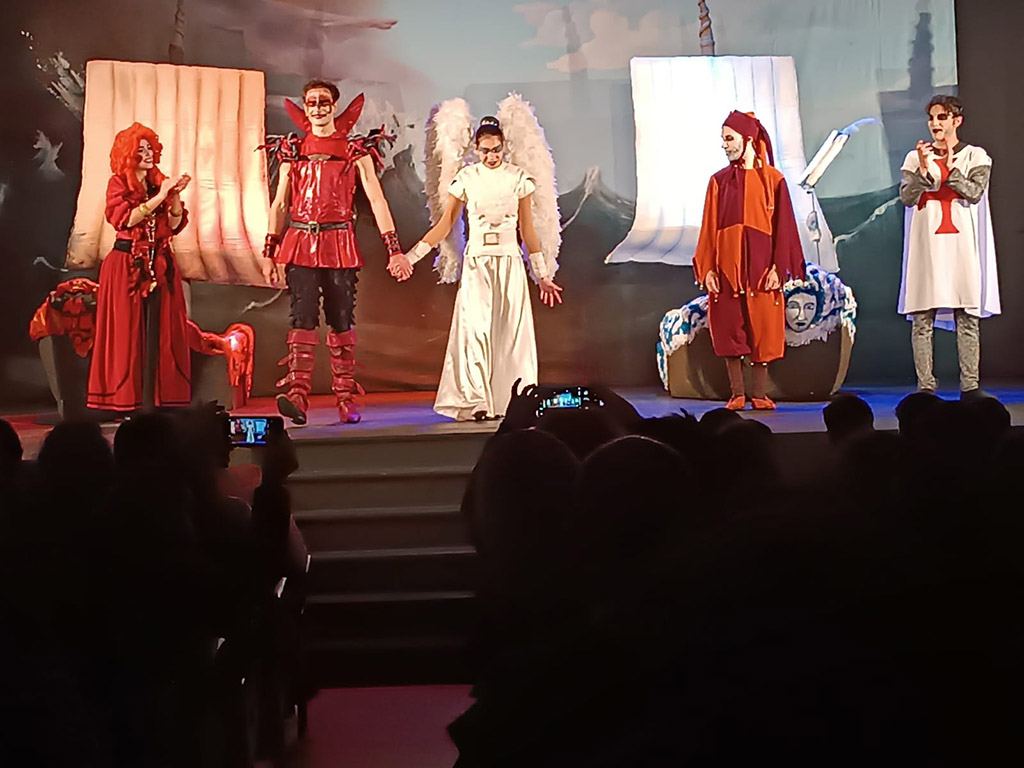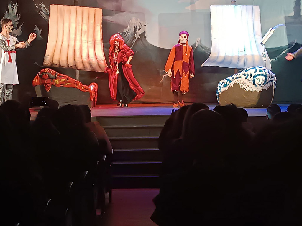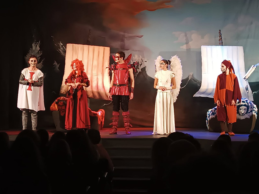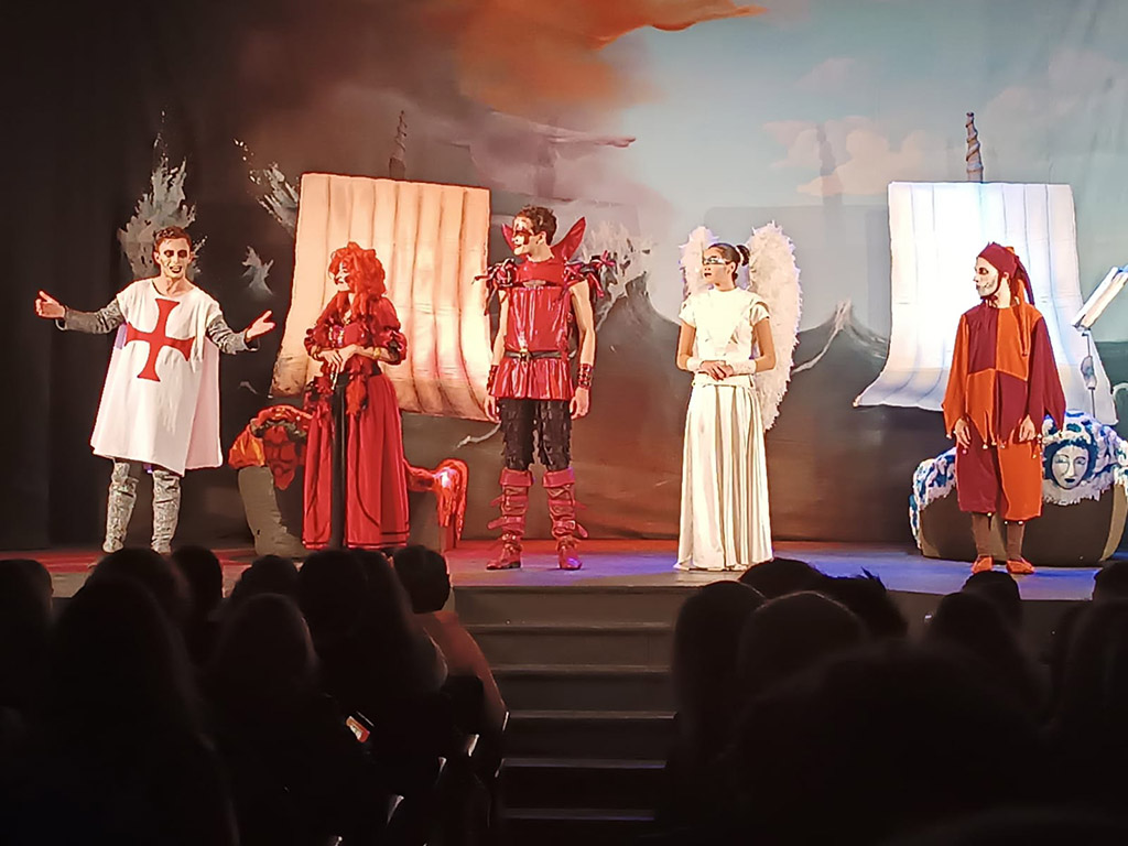 No passado dia 1 de março, os alunos do 9º ano deslocaram-se ao Auditório Pe. Heitor Vieira Pinto, em Perafita, para assistirem à representação da peça de teatro “Auto da Barca do Inferno”, de Gil Vicente. O espetáculo foi produzido pela Companhia de Teatro “O Sonho”, que, de forma divertida e interativa, tentou adaptar o auto vicentino ao contexto dos alunos, no século XXI. Tratou-se de uma atividade enriquecedora, que permitiu complementar o estudo da obra realizado em aula, através da confrontação entre o texto escrito e a sua transposição para espetáculo teatral.