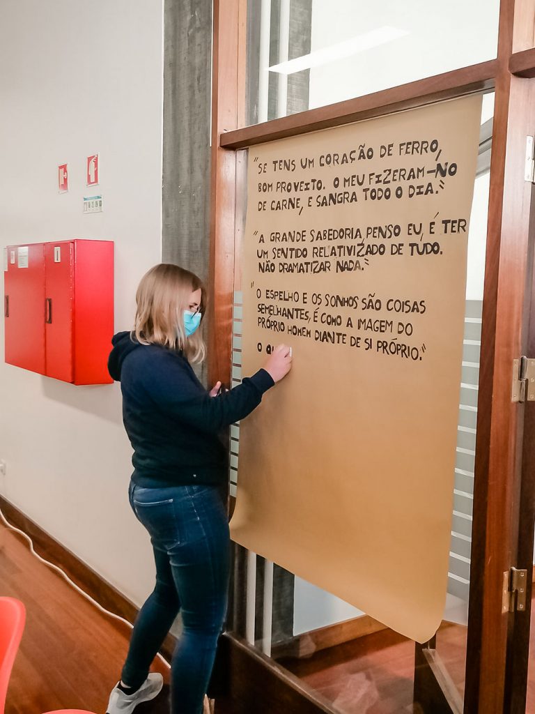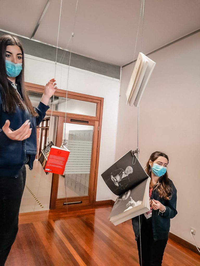 Tendo como desafio as palavras do próprio José Saramago “A viagem não acaba nunca. Só os viajantes acabam. E mesmos estes podem prolongar-se em memória, em lembrança, em narrativa.”, os alunos do 11º ano realizaram uma “viagem” pelos textos do Nobel da Literatura português. A descoberta e a seleção de textos resultaram numa coletânea que integra uma instalação exibida no espaço de exposição do Ensino Secundário e que constitui o início da homenagem a José Saramago, a prolongar-se até novembro de 2022.