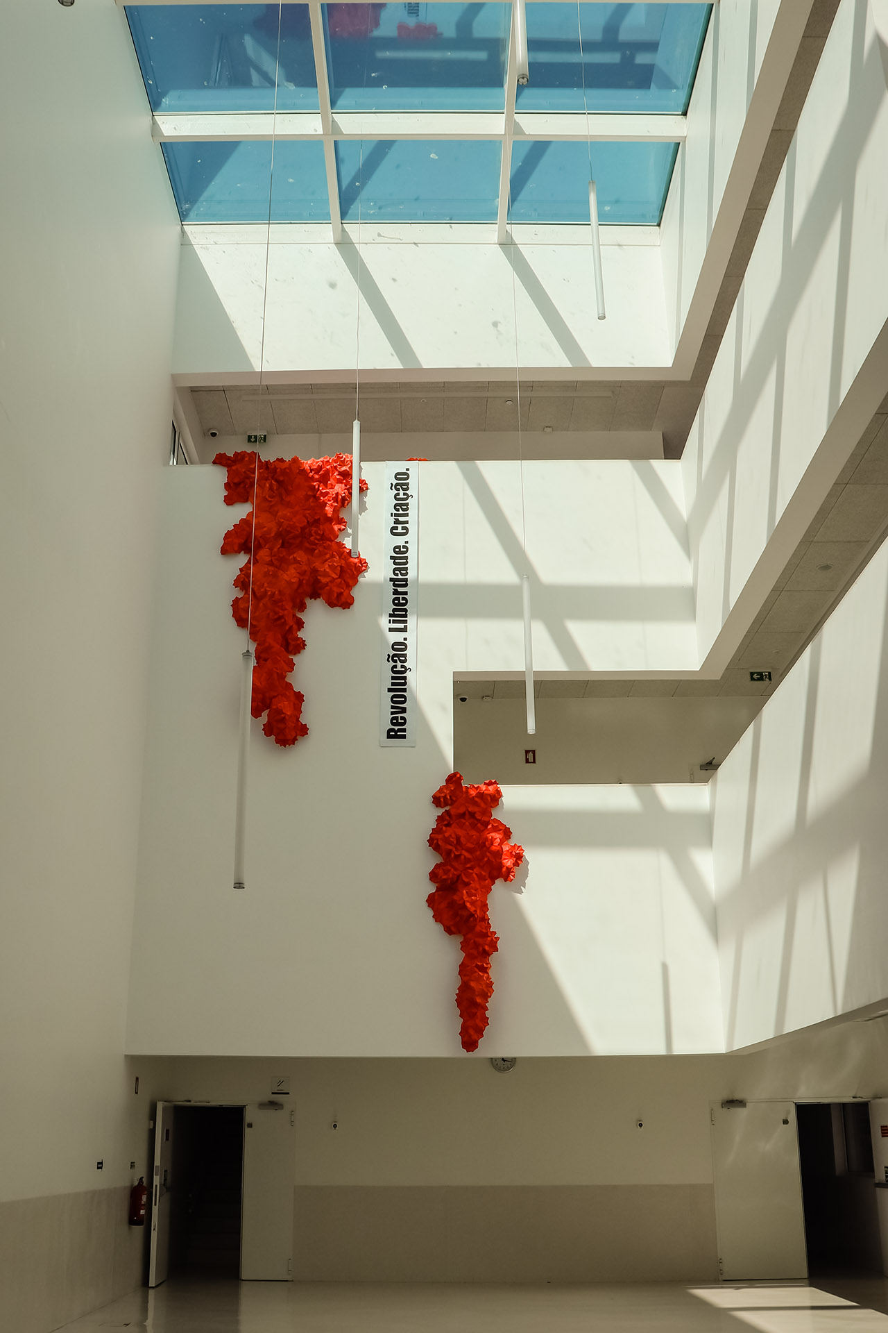 Os módulos de origami, dispostos de forma irregular e dinâmica, sugerem a imagem de um mar de cravos vermelhos, representação simbólica e poderosa da revolução, e criam uma sensação de movimento e fluidez, representando a constante evolução da democracia. O vermelho, como símbolo de paixão e coragem, evoca os ideais revolucionários e a energia libertadora do 25 de abril.