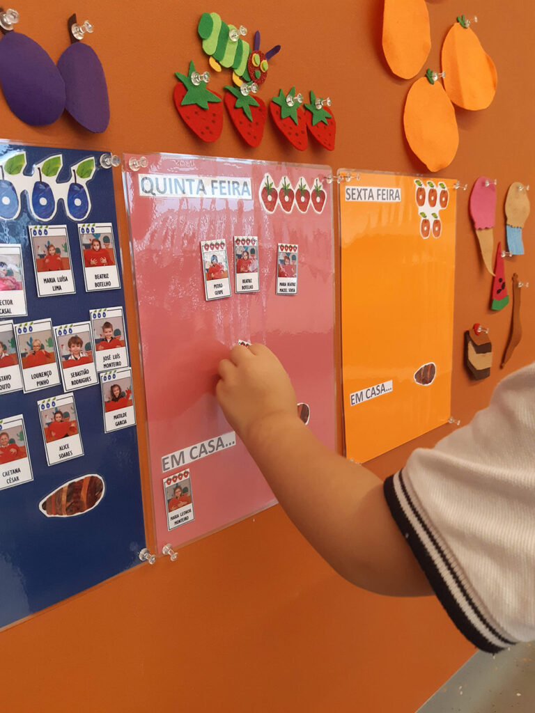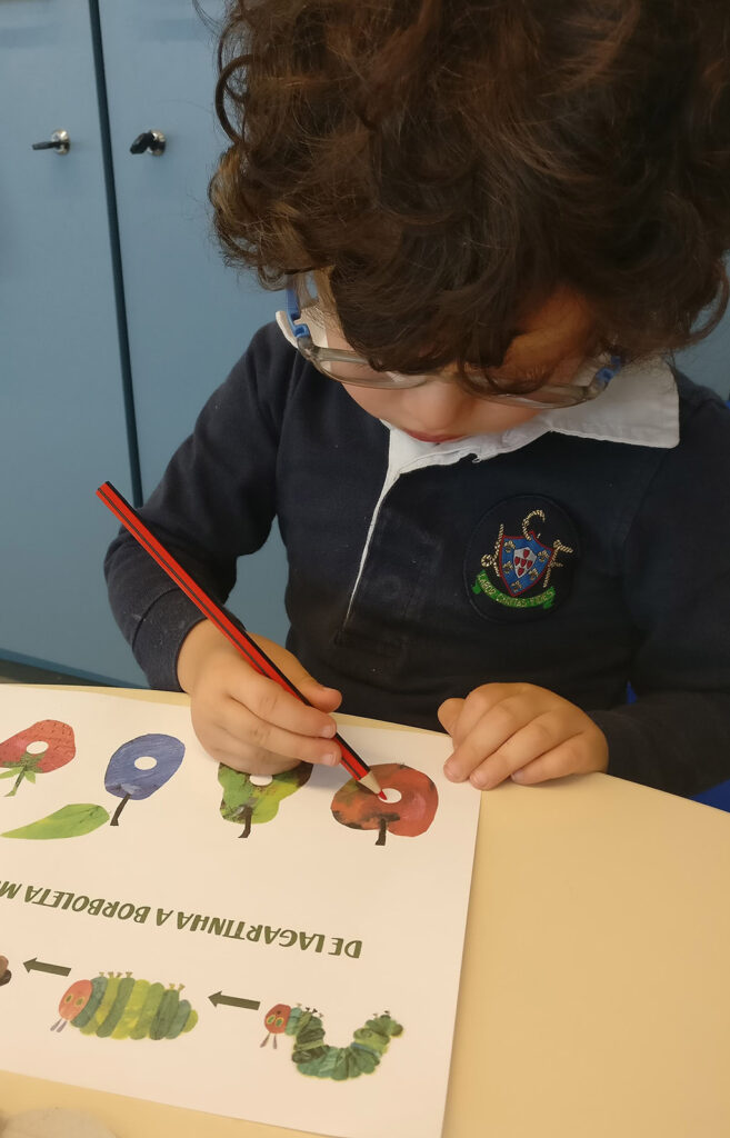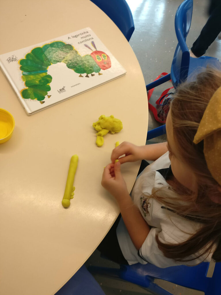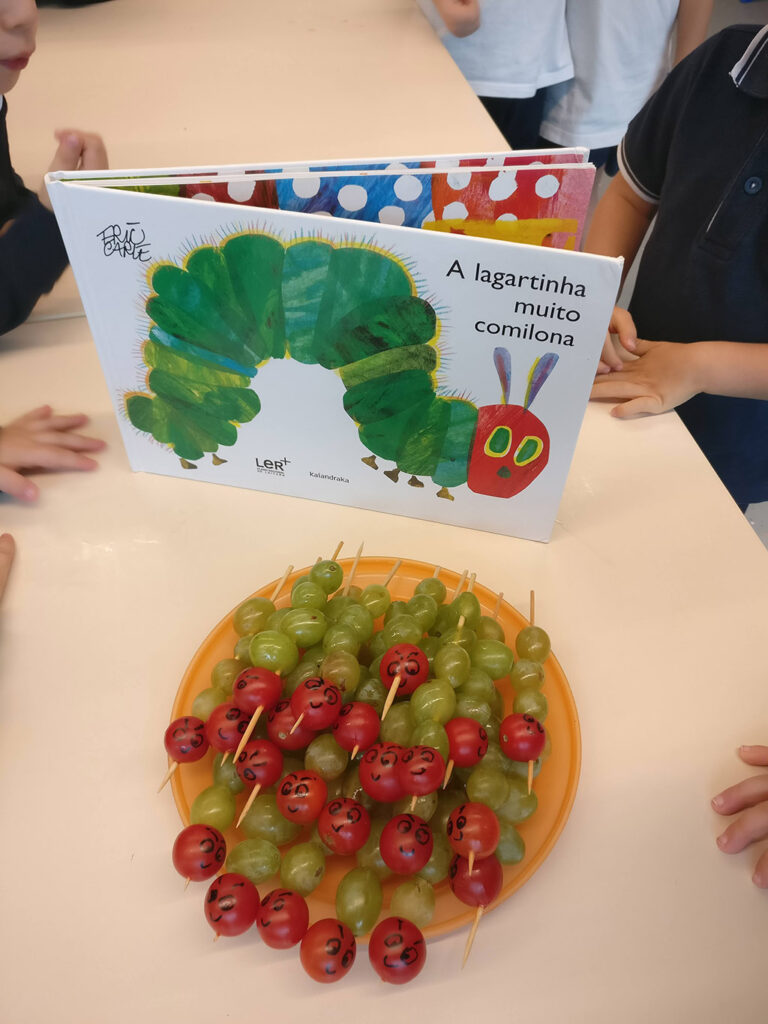 Durante o mês de Outubro, os grupos de 3 anos exploraram a história a Lagartinha muito Comilona, de Eric Carle. O envolvimento foi tanto que as atividades foram surgindo dia após dia. De acordo com os interesses das crianças, a história serviu de mote para a construção do quadro de presenças, permitiu fazer contagens, associar diversos alimentos a uma alimentação saudável, confecionar espetadas/lagartas de fruta, modelar pequenas lagartinhas e conhecer o ciclo de vida da borboleta.