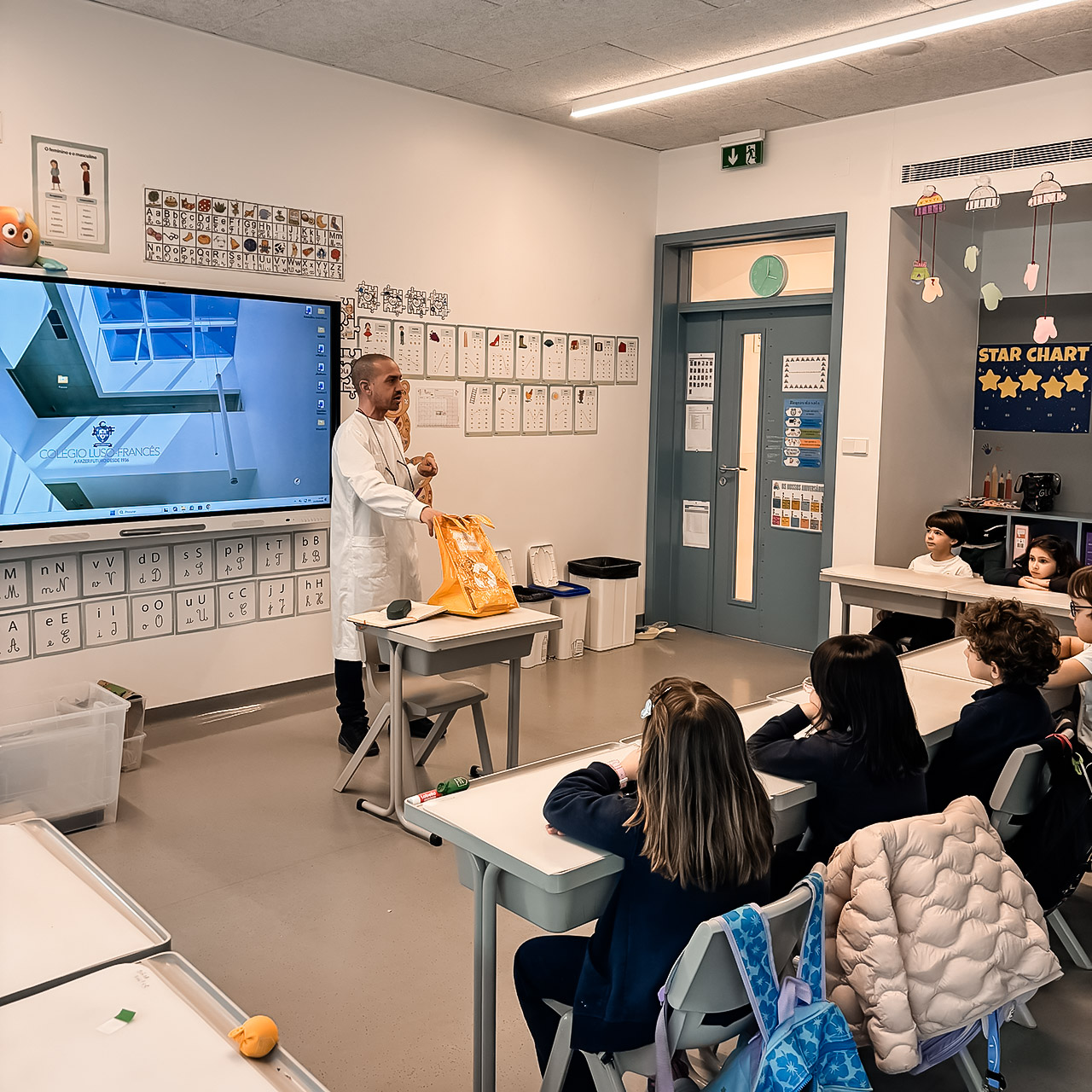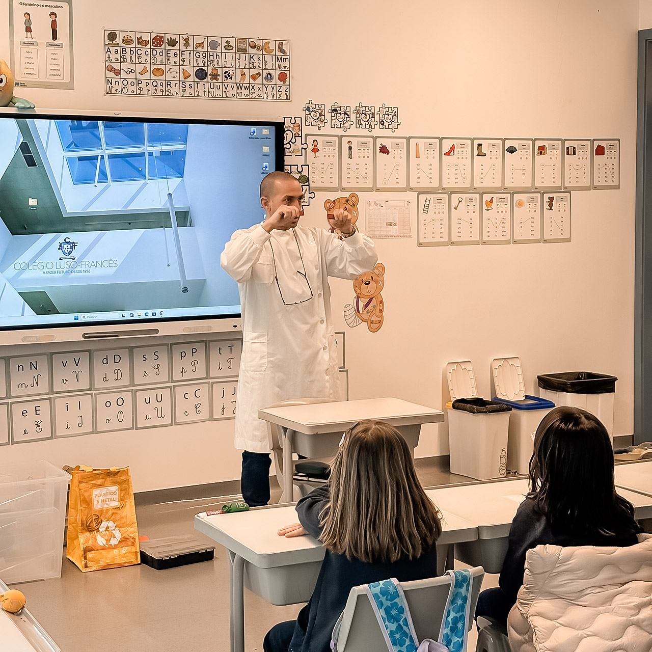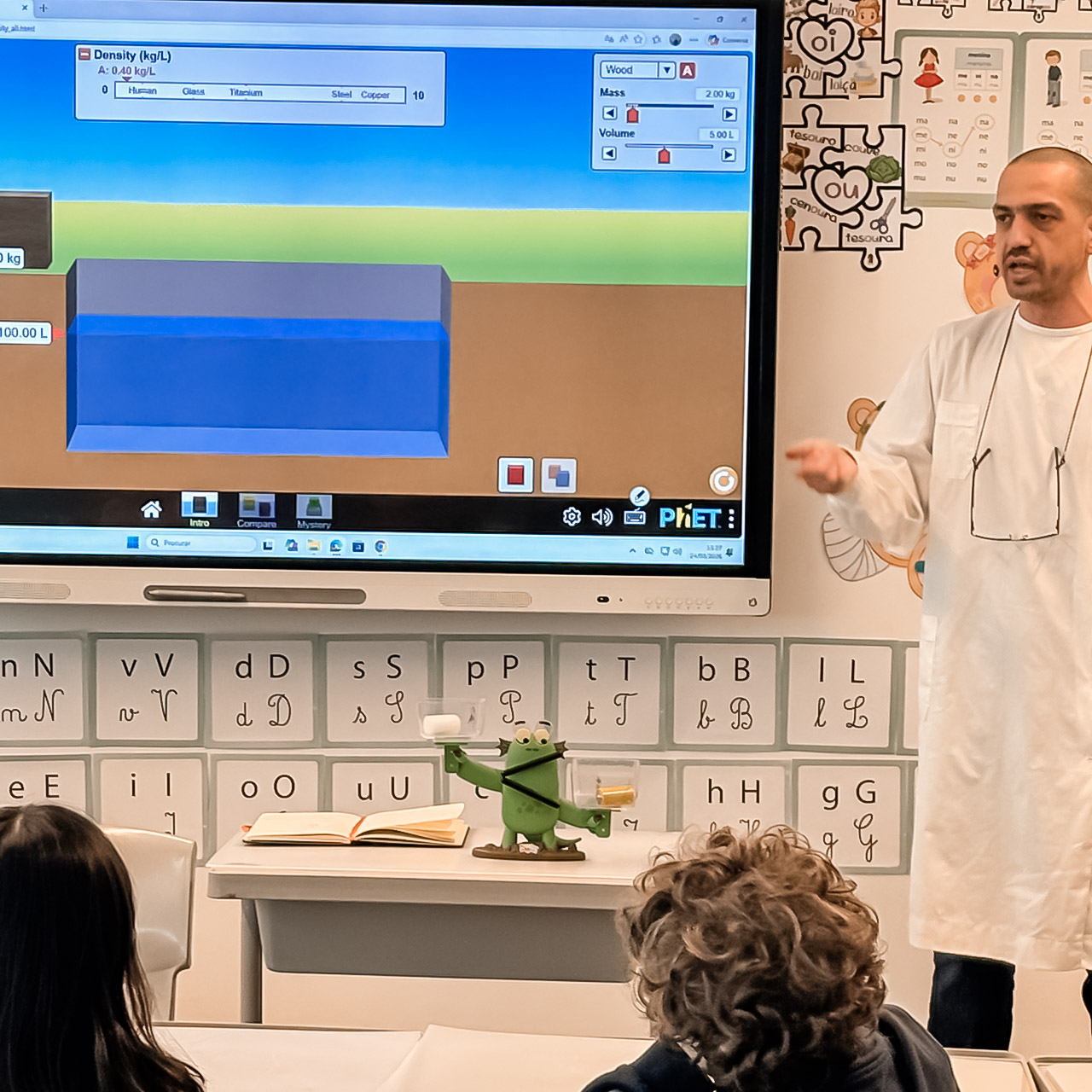 O cientista Nuno abordou a densidade de uma forma simples. Explicou-nos porque é que alguns objetos flutuam e outros afundam através de um programa “especial” no nosso quadro. Experimentámos diferentes materiais e discutimos como o “peso” e o “tamanho” influenciam este comportamento.