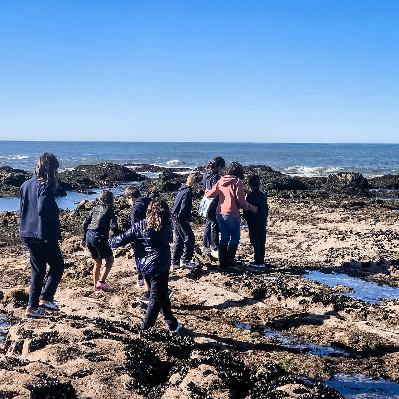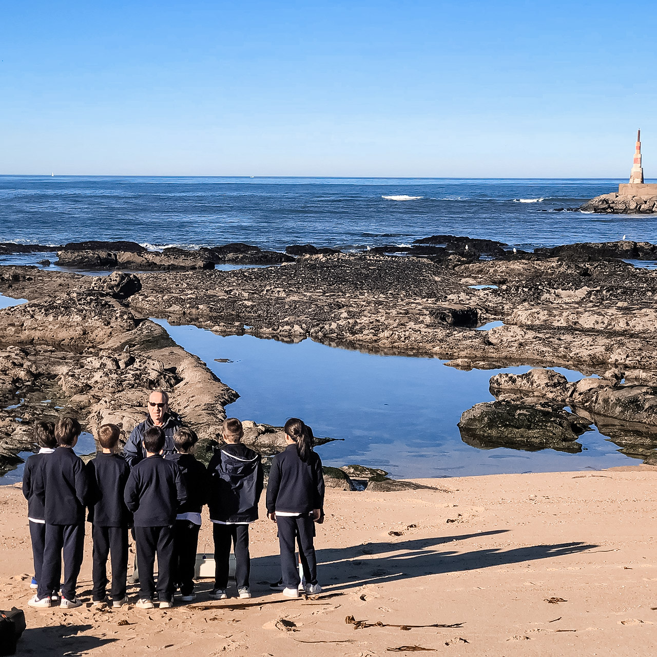 Durante a manhã, os alunos exploraram a zona entre marés, onde descobriram diferentes seres vivos e as condições de vida a que estão sujeitos. Com o apoio dos guias, compreenderam o funcionamento destes ecossistemas e a sua importância para o equilíbrio da natureza.